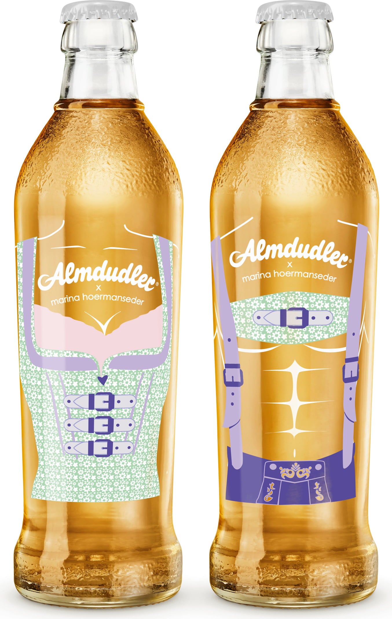 For Oktoberfest this year, Almdudler has teamed up with star designer Marina Hoermanseder to present a striking new Oktoberfest Edition 2025! The limited edition variant features a classic Oktoberfest look that combines traditional Austrian costume with a playful twist. Whether it's the dirndl with buckles or stylish lederhosen with a six-pack, these 0.35 litre returnable glass bottles are sure to turn heads and are the ideal refreshment at get-togethers. The designs combine Hoermanseder's signature style with Almdudler's core values: conviviality, a zest for life and Alpine tradition. As an official licence partner of the Munich Oktoberfest, Almdudler adds a breath of fresh air to the festivities - available for a limited time in selected venues in Munich and exclusively in our webshop.